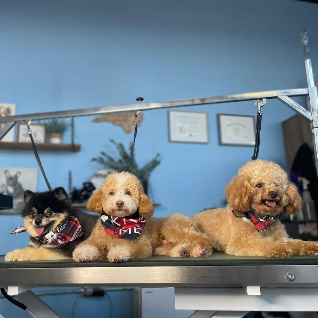 Look at this trio of perfection! Perched confidently on the grooming table, these three freshly fluffed pups define #SquadGoals. The clean blue backdrop and framed certificates set a professional stage, but the real showstopper is the coordination of their festive bandanas. Whether it’s a classic red plaid pattern or a cheeky “Kiss Me” slogan, these accessories serve as your salon’s visual signature.