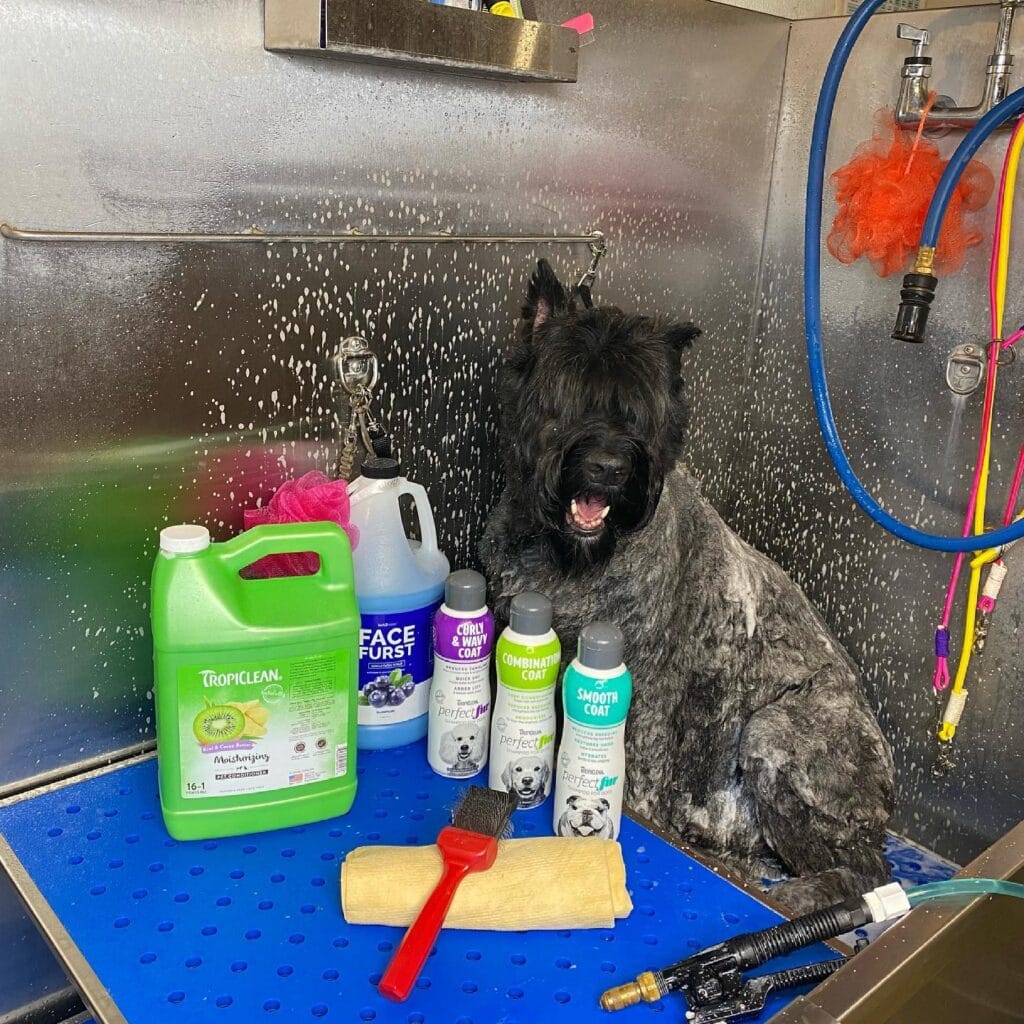 Look at this professional setup! Inside the gleaming stainless steel tub, a charismatic, shaggy dog sits patiently on a vibrant blue mat, surrounded by an arsenal of grooming magic. This image perfectly illustrates the power of offering a customized conditioning service. You can clearly see the large green jug of moisturizing conditioner and the specific bottles designed for curly, combination, or smooth coats. By stocking a variety of formulas, like the blueberry “Face Furst” scrub seen here, you ensure every pup gets exactly what their unique fur texture requires.