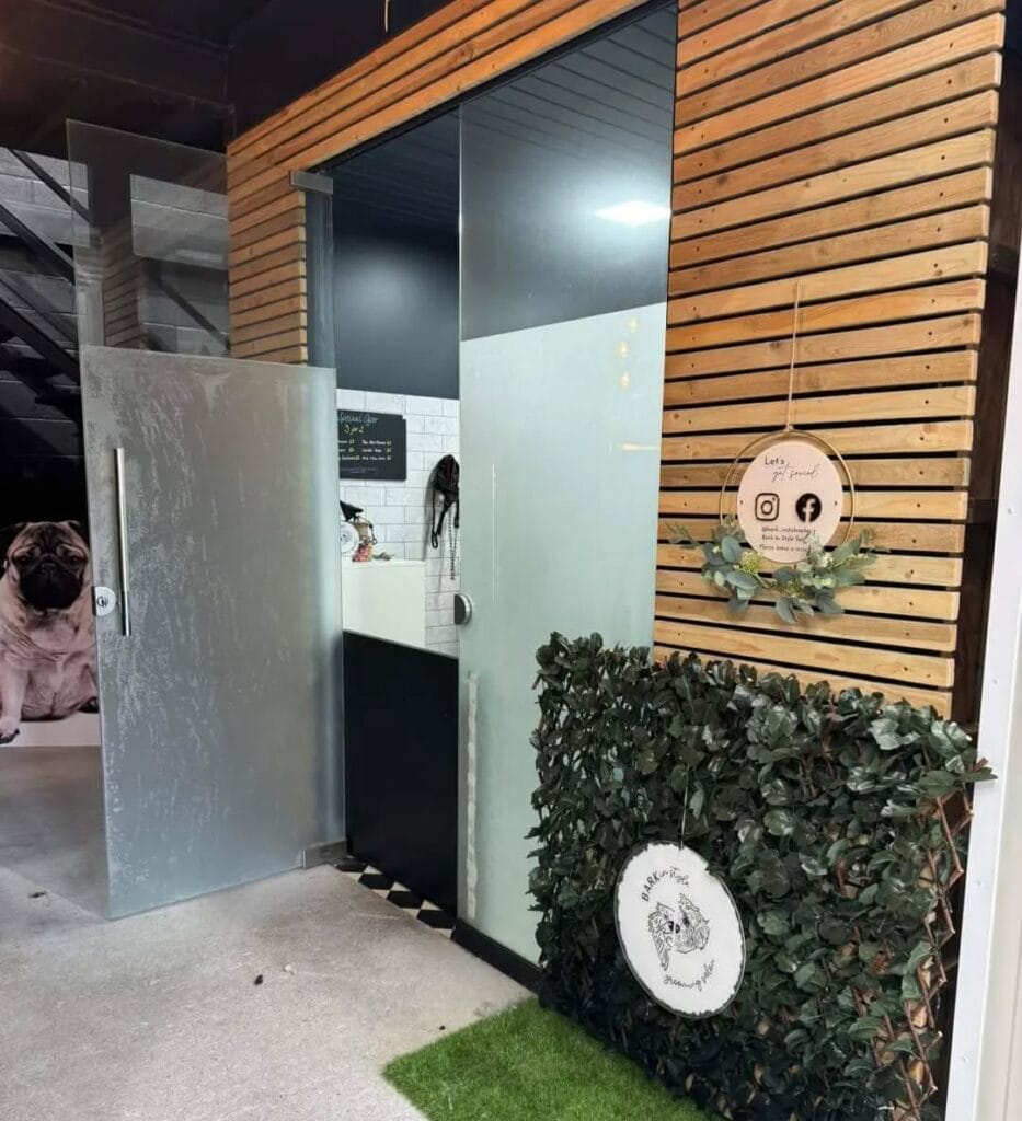 Step into a space where modern design meets canine psychology. In this salon setup, the standout feature is undoubtedly the floor-to-ceiling glass entryway featuring a frosted mid-section. This smart design choice serves a dual purpose: it maintains an open, airy feel while blocking the direct line of sight for dogs inside. By obscuring the view of the street or the lobby, you significantly reduce barrier frustration and barking at passing distractions.