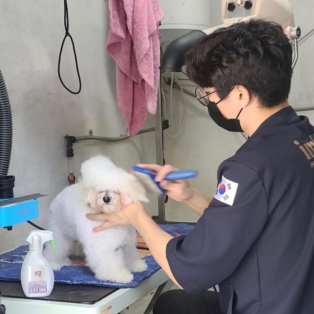 In this shot, we see the meticulous attention required to make a white coat truly pop. The groomer is carefully fluffing a cloud-like Bichon, but the secret weapon sits right on the table: a bottle of K9 White Magic Silver Shine. When you are grooming white breeds, battling dingy fur or tear stains is the hardest part of the job. By keeping specialized brightening sprays and conditioners at your station, you ensure that snow-white appearance isn’t just clean—it is brilliantly luminous.