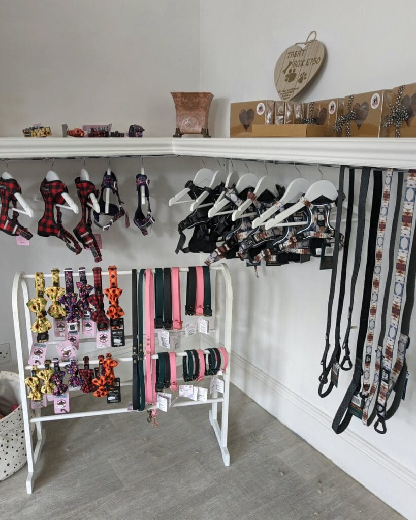 Transforming your waiting area into a curated shopping experience is a brilliant way to boost revenue per client. As seen in this inviting salon setup, a clean white aesthetic allows the colorful products to truly shine. The visual appeal here is undeniable; neatly spaced hangers display stylish harnesses in red buffalo check and modern geometric prints, while a freestanding white rack showcases a variety of bow ties and leashes. The top shelf adds charm with rustic “Treat Boxes” and heart-shaped signage, creating a visually appealing focal point that draws the eye upward.