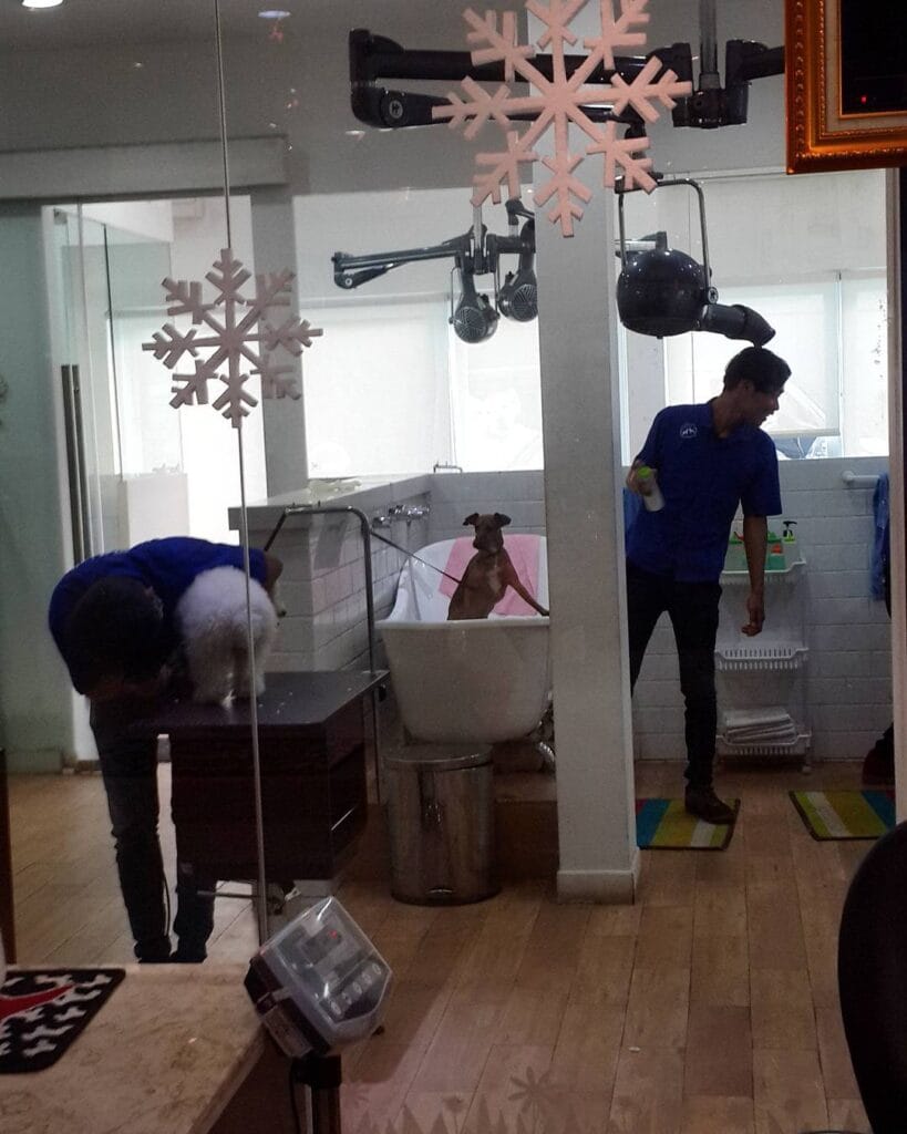 Create an atmosphere of complete transparency by utilizing floor-to-ceiling glass partitions instead of solid walls. As seen in this vibrant salon, this open-concept design transforms a standard grooming session into a trustworthy spectator event. You can see the diligent groomer on the left skillfully scissoring a white fluffy dog, while a curious brown dog stands tall in the bathtub, peering out at the lobby through the glass. This visibility eliminates the mystery of what happens in the back, alleviating the fears of anxious owners who worry about how their pets are handled behind closed doors.