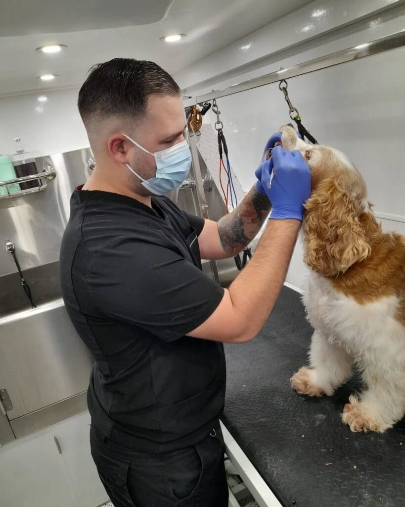 The image captures a moment of pure focus: a professional groomer, clad in black scrubs and protective gear, gently examining the teeth of a cooperative Spaniel inside a well-equipped mobile unit. This level of care goes beyond a simple haircut. By incorporating dental hygiene checks into your repertoire, you elevate your services significantly. Notice the stainless steel tub and professional lighting in the background; they scream cleanliness, but it is the groomer’s delicate touch with blue nitrile gloves that builds real confidence with the pet parent.