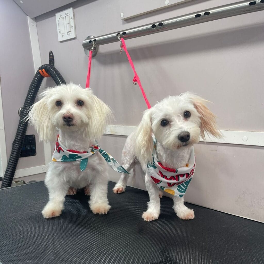 Look at this adorable pair! Standing tall on the textured black grooming table, their snowy-white coats are perfectly fluffed, but the real showstopper is the styling. By adding matching tropical bandanas, you instantly elevate a standard groom into a memorable photo opportunity. The vibrant watermelon and leaf patterns pop beautifully against their light fur and the bright pink grooming loops, creating a cohesive aesthetic that screams summer fun.