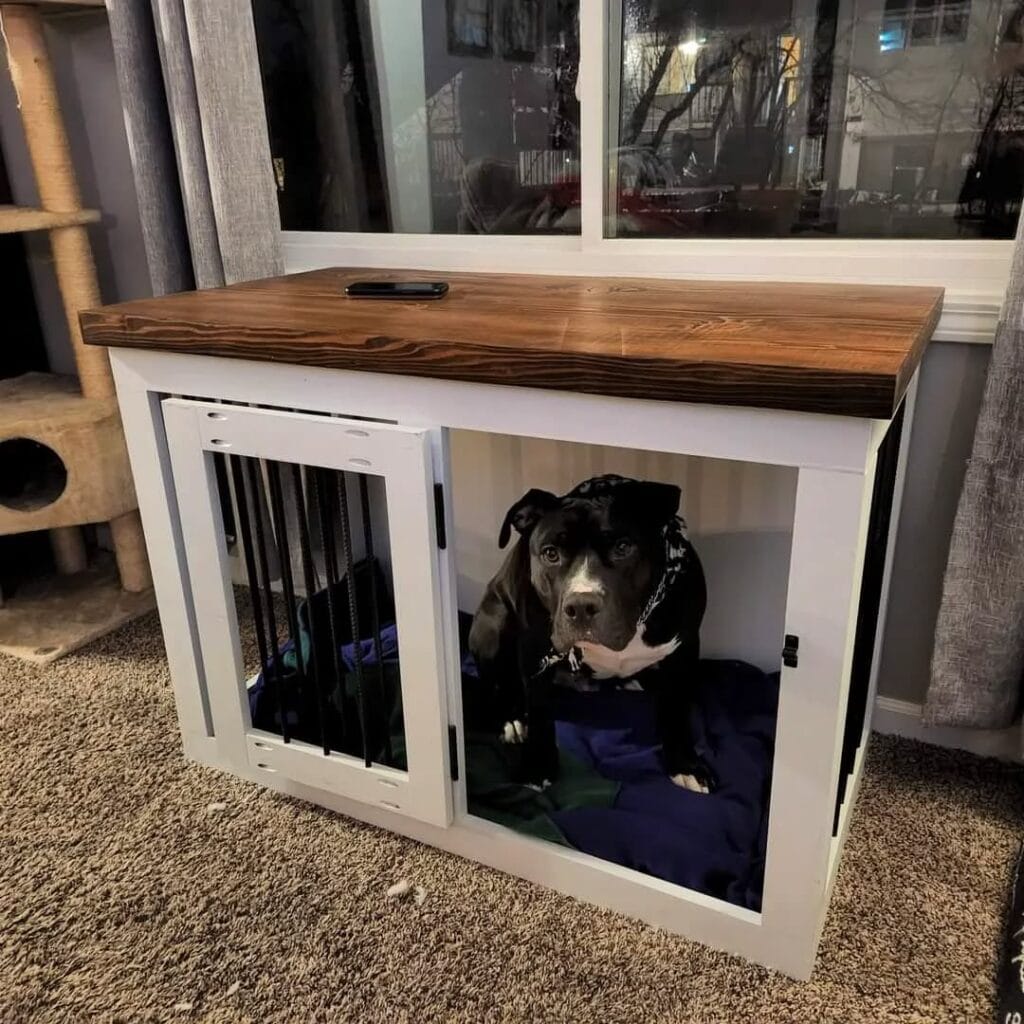 Your guests set their drinks on it without realizing your dog’s napping inside. This farmhouse-style dog crate transforms a basic 36-inch wire cage into functional furniture with a rustic wooden top. The white painted name “HAAS” adds personalized charm that makes it feel like custom-built decor, not pet gear.