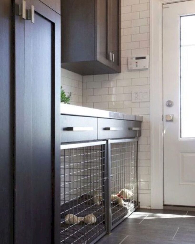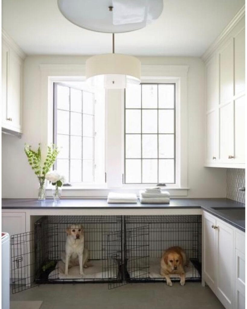 Your guests will never know two large dogs live in your bright white kitchen. These custom-built crates sit perfectly under the countertop between floor cabinets, with black metal doors that match the window frames. The wire construction keeps both dogs visible and ventilated while you’re cooking dinner 3 feet away.