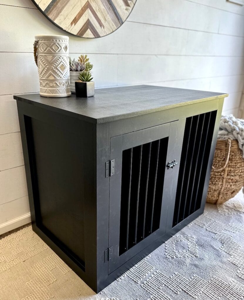 Style the top surface with a small plant and books. Guests think it’s decorative storage, not a dog crate, until they spot the sleeping pup inside.
