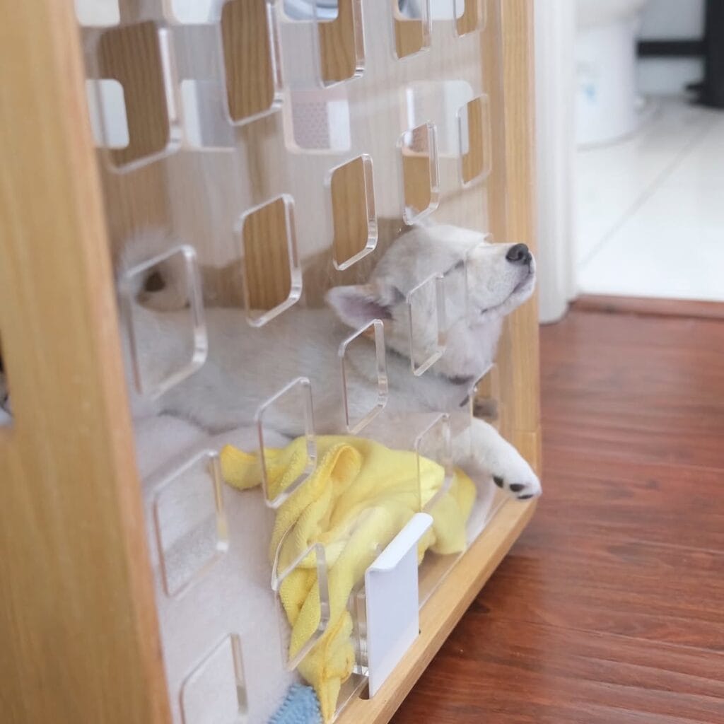 Your white pup presses her nose against the transparent panel every morning, watching you make coffee. She’s contained but connected—no bars blocking her view, no fabric hiding her face. This clear acrylic divider system transforms a standard wooden crate frame into something that feels less like a cage and more like a thoughtfully designed piece of home architecture.
