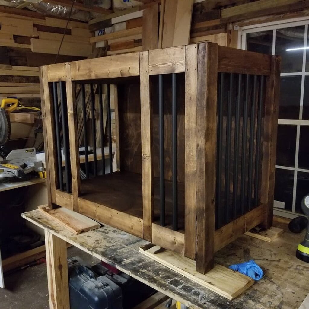 Your garage workshop doesn’t need to look like a pet store exploded. This custom-built crate features natural wood framing with dark metal vertical bars that match your tool chest’s industrial vibe. The 36x24x30-inch structure sits on a workbench, perfectly sized for a medium breed like a Beagle or Cocker Spaniel.