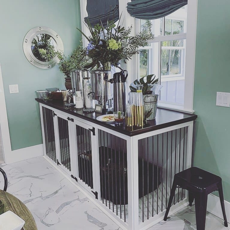 Your guests have complimented this piece six times already—and none of them realized it’s a dog crate. This white shiplap cabinet with dark countertop measures approximately 48 inches long by 24 inches deep by 36 inches high. It features vertical slat doors on both sides so your dog can enter from either direction.