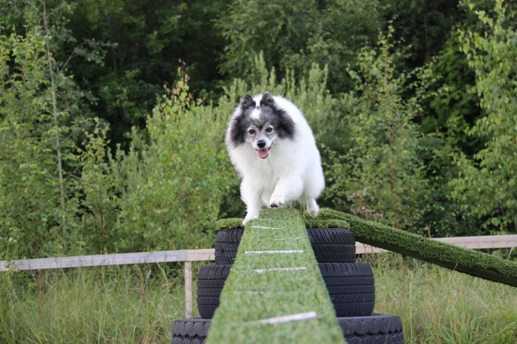 The setup uses six old tires stacked in pairs. Artificial turf planks (2 feet wide, 8 feet long) create the bridge deck. White pool noodles slice lengthwise mark the edges so your dog stays centered. It sits 18 inches high—perfect for medium dogs like this Keeshond. The angle creates a gentle climb up and descent down.