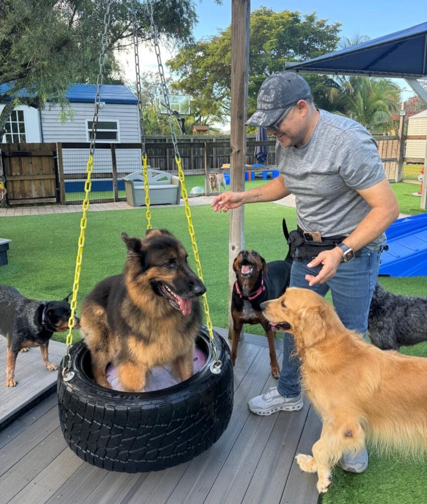 Notice how the handler stands center stage. He controls which dog accesses which toy from that position. The swing tire hangs from yellow powder-coated chains that won’t rust in rain. One large-breed dog sits inside while a Rottweiler and Golden Retriever wait nearby for rotation.