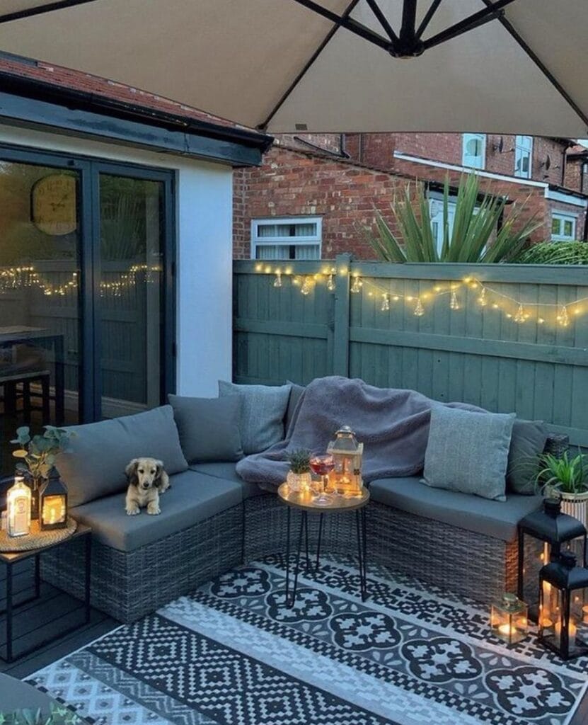 This 10×12 covered patio works as your relaxation spot and your dog’s outdoor hangout. The sectional sofa setup gives her a place to curl up while you sip coffee. The patterned outdoor rug defines the space without showing muddy paw prints. String lights create ambiance so you’ll actually use this space after sunset.
