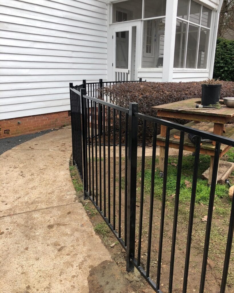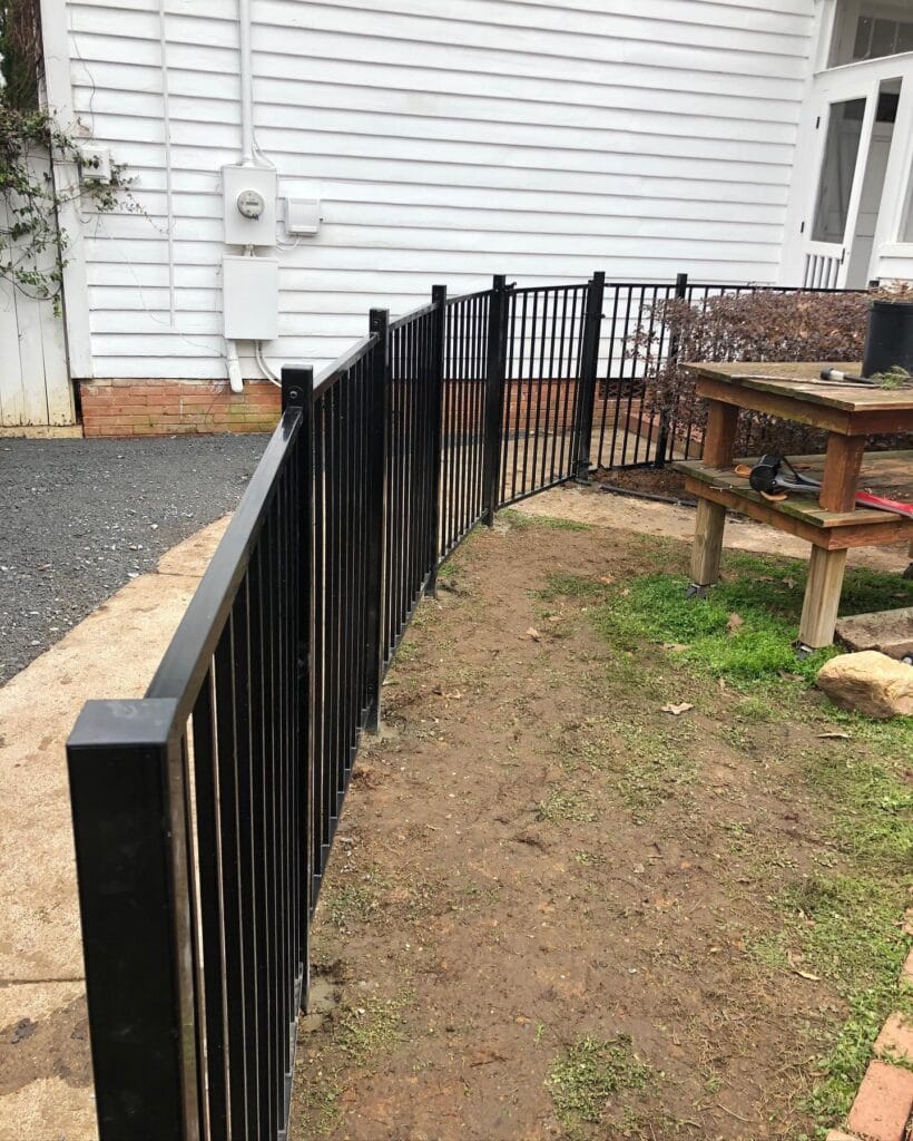 The black aluminum fence runs along the driveway edge with 4-foot height. It keeps your dog contained without blocking house views. Vertical picket spacing is 2 inches—small enough for terriers, wide enough to feel open. Three post sections let you follow the slope without custom cutting.