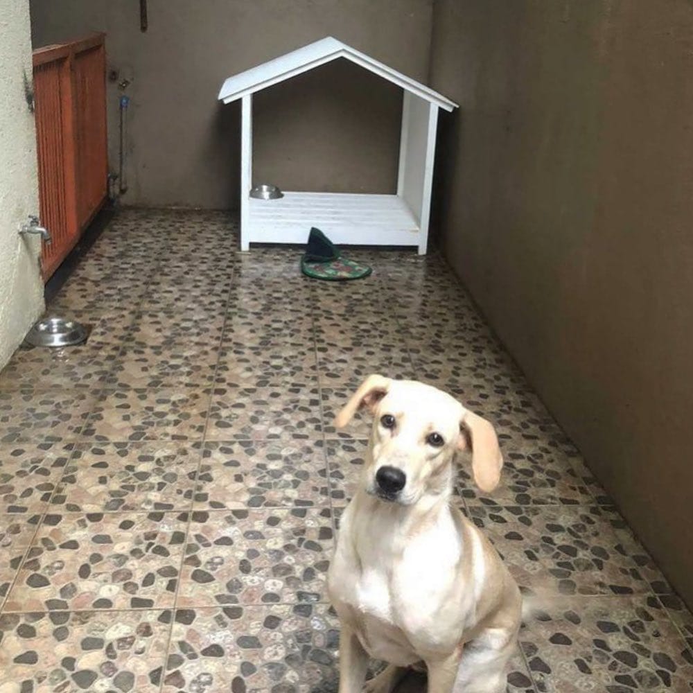This 10×12 side yard setup turns awkward space into functional dog zone. The terrazzo tile floor drains fast and hoses clean in 3 minutes. That white house-style shelter defines her rest area while keeping food bowls dry during monsoon season. The tan walls create privacy so she doesn’t bark at every passing stranger.