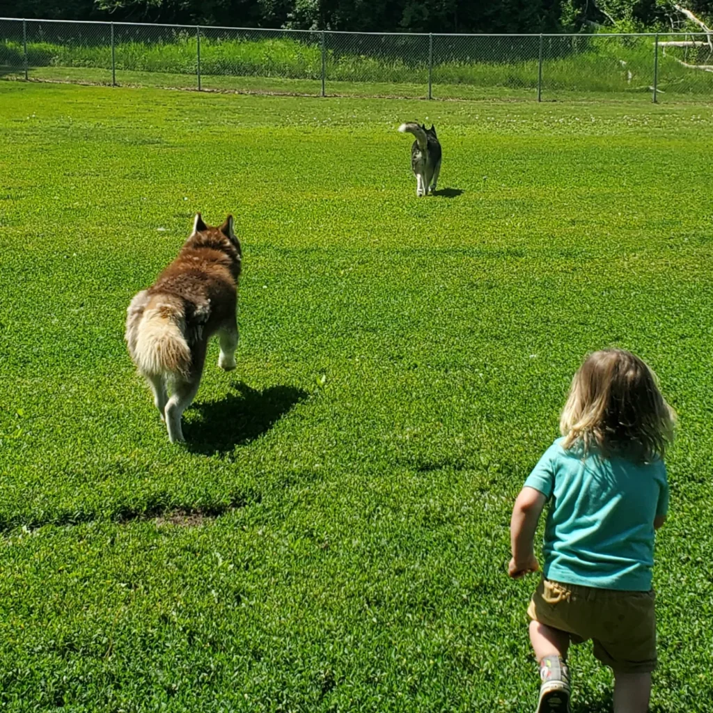 This open-space dog run doubles as a play yard — lush, clipped Kentucky bluegrass, a chain-link perimeter fence standing about 4 feet tall, and enough room for two large huskies and a toddler to run full speed without anyone crashing into a wall.
