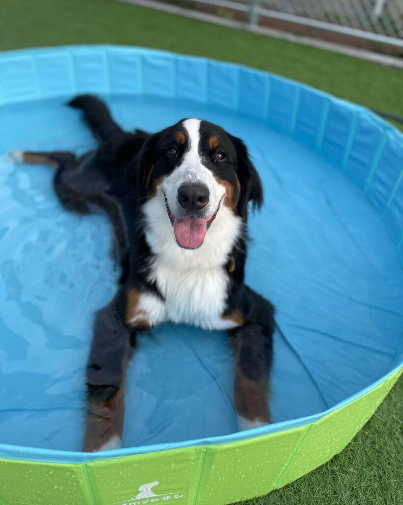 Fill the pool with just 2-3 inches of water — enough for your dog to flop down and cool off without turning it into a full splash disaster. After each use, tip it, drain it, and let it dry flat before folding it back up. That’s it. No mold, no mess.