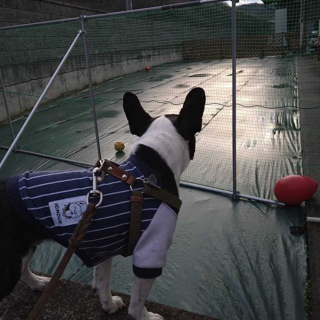 The setup in this photo uses green turf-style matting laid over a flat concrete base, wrapped in a green mesh net stretched across white PVC or metal poles. It’s compact but fully enclosed — like a little sports court, just for your pup. And the wet surface here? Still grippy enough for a dog wearing leg wraps and a harness coat to stand comfortably.