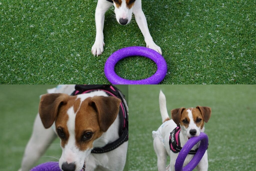 Grab a 10–12 inch EVA foam ring toy (the purple ones are chef’s kiss), a patch of artificial turf mat, and a pink adjustable harness so your pup stays secure during play. The ring’s lightweight design means she can carry it herself — no chasing required, finally.