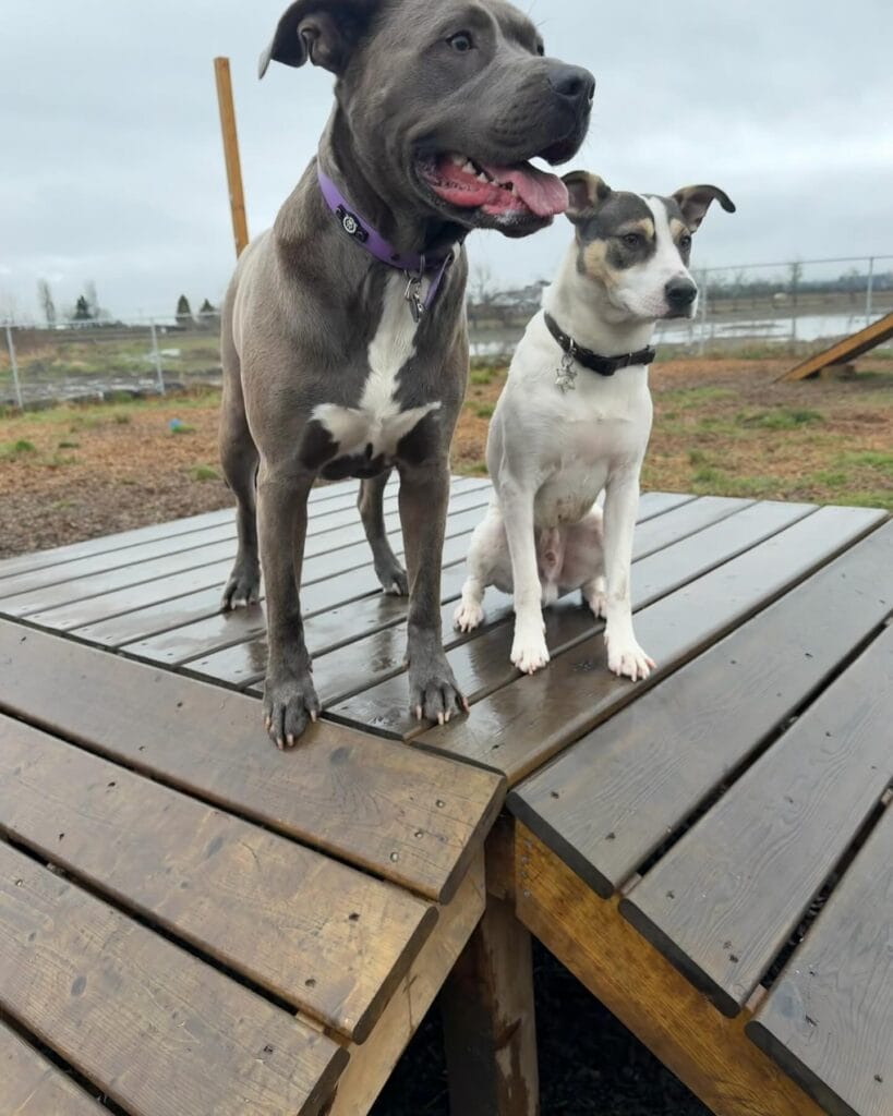 This setup is two dogs standing proud on a raised wooden platform built right into the dog run — and honestly? It looks so good it could pass as backyard decor.