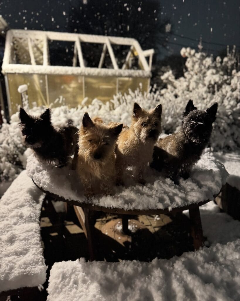 This setup? It’s giving cozy winter wonderland meets totally functional dog space. Four Cairn Terriers are perched on a round wooden picnic table dusted in snow, with a small glass greenhouse glowing warm in the background. It’s chaotic and adorable and honestly Pinterest-perfect.