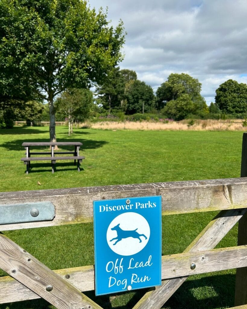This off-lead run uses a 5-bar wooden farm gate as the entry point, which gives it that countryside charm without looking like a cage. The interior is lush green turf with a dark composite picnic bench tucked near a shade tree — so you can actually sit and enjoy the space while she runs.