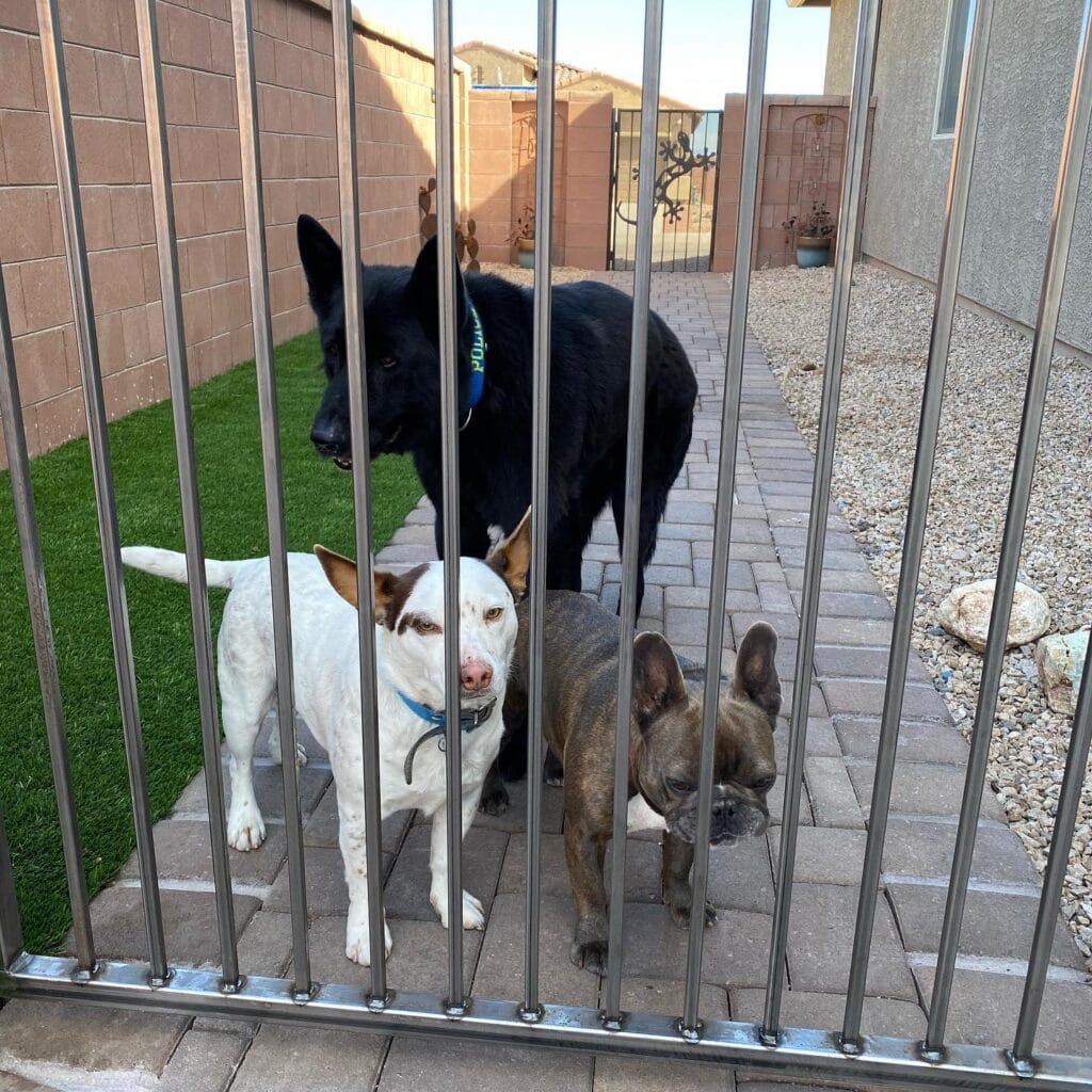 Three dogs. One gate. And that look — you know exactly the one — where they’re all smooshed together staring at you like you personally wronged them by being inside.