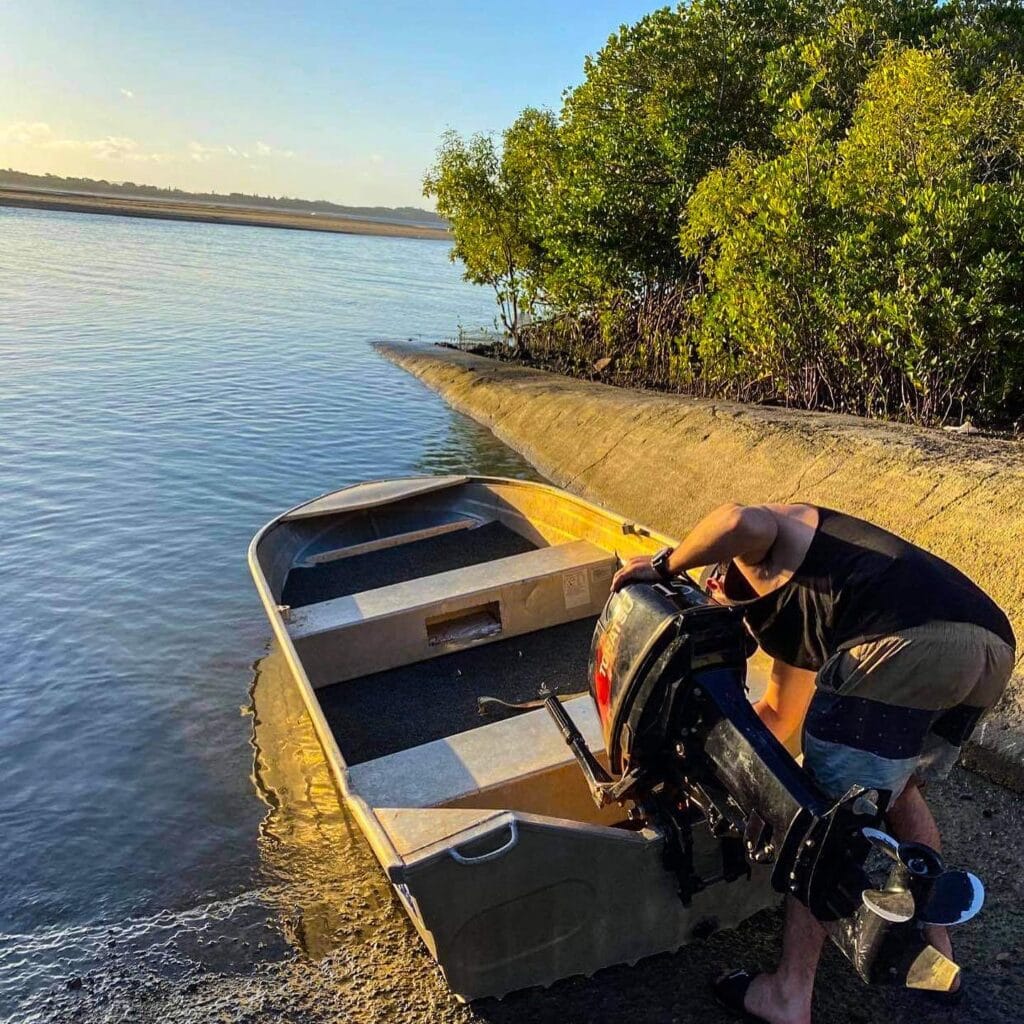 This setup is giving serious coastal adventure vibes — a flat aluminum boat pulled up to a narrow sandy bank, surrounded by mangrove trees, with calm water stretching out in every direction. A dog would absolutely lose her mind here in the best way.