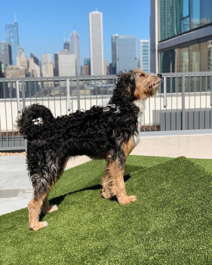 Your golden retriever has finally found her spot. This rooftop dog run setup is everything — artificial turf panels laid over a concrete deck, a metal railing perimeter, and a skyline backdrop that honestly makes it look like a luxury penthouse moment for dogs.