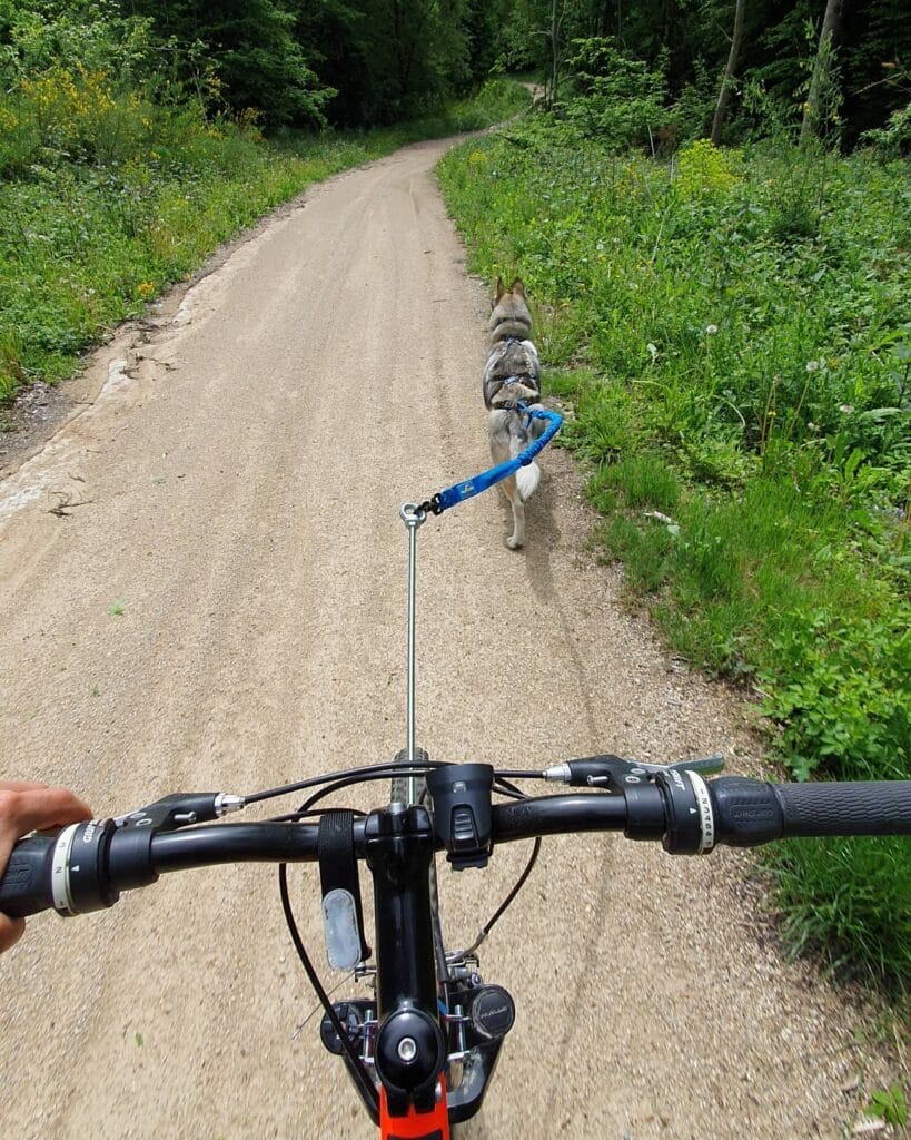 The rider attaches a bungee biker leash (this one’s in blue) to a metal springer arm mounted directly to the bike’s stem. The springer arm – usually 12–18 inches of steel rod – acts as a buffer, keeping the dog safely out of the front wheel’s path. The dog wears a sled-style pulling harness (not a collar – never a collar for this) that distributes pressure across the chest and shoulders.