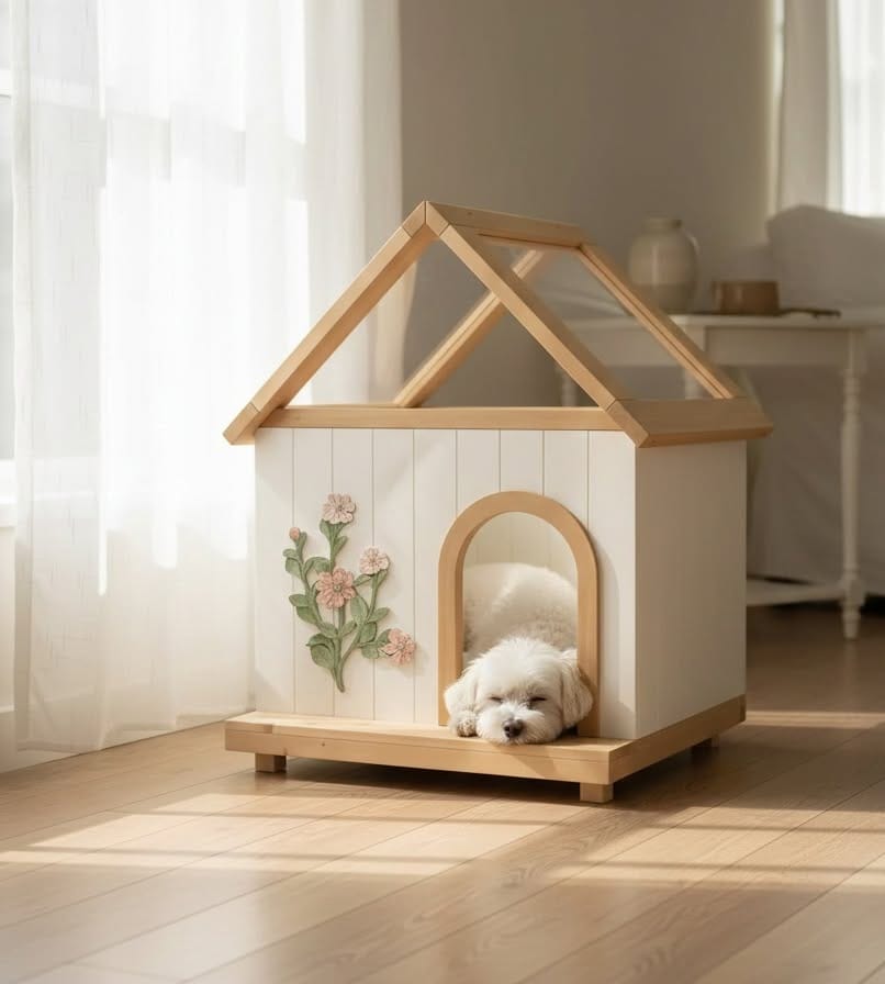 This white wood-paneled indoor dog house with a natural pine open-frame roof is genuinely stunning. The arched entryway adds warmth, and that hand-painted floral detail on the side? Chef’s kiss. Any dog feels safe in an enclosed-yet-open space like this — the transparent roof lets light in without making it feel like a cave.