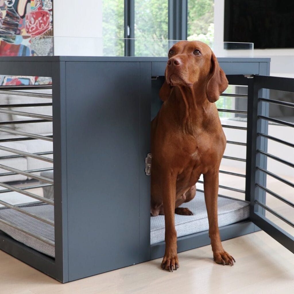 The crate in this photo sits in a bright, modern living space with large windows and warm wood floors. It’s built from matte slate-blue painted wood panels paired with horizontal steel bar rails, and it doubles as a side table or console. Your dog gets a den. You get decor.