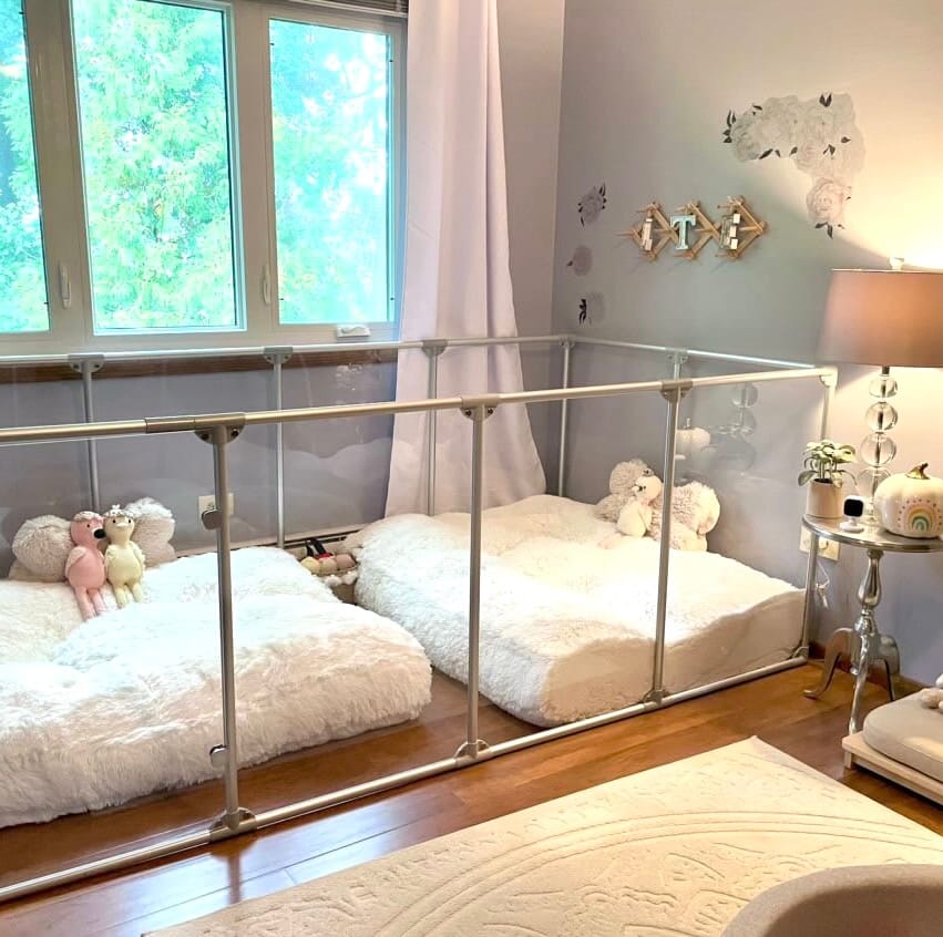 This setup stopped me cold when I first saw it. Two fluffy floor-level mattresses sit inside a silver PVC pipe frame with clear acrylic panel sides — the whole thing looks less “dog enclosure” and more “chic toddler play yard.” The soft blue-gray walls and white faux fur bedding make it feel calm and cozy, like a little den your dog actually wants to be in.