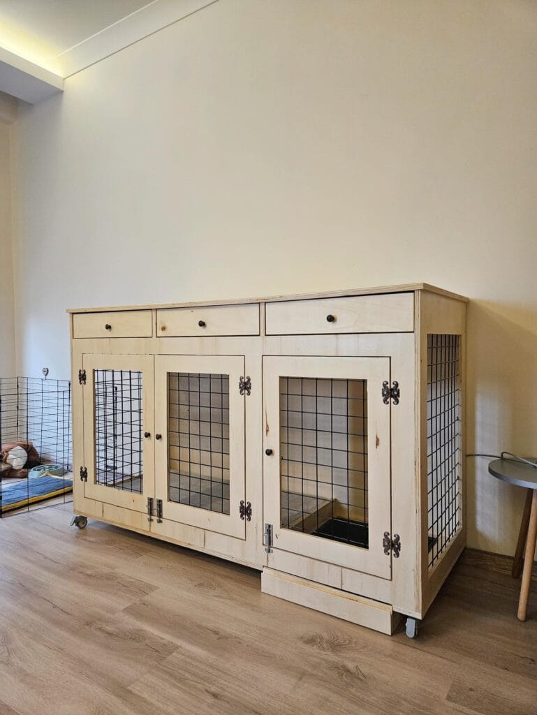 Size your crate to at least 42 inches wide for a large breed. And if you’re going custom, adding a sliding door latch instead of a swinging one saves so much floor space.