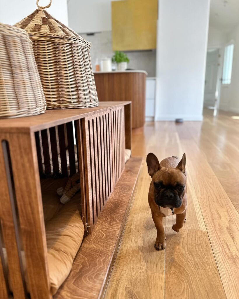 Place the crate in a corner under a sloped ceiling or staircase — that dead space becomes purposeful storage. And keep the side door open when your pup is home; it makes the space feel less like a cage and more like her own little room.