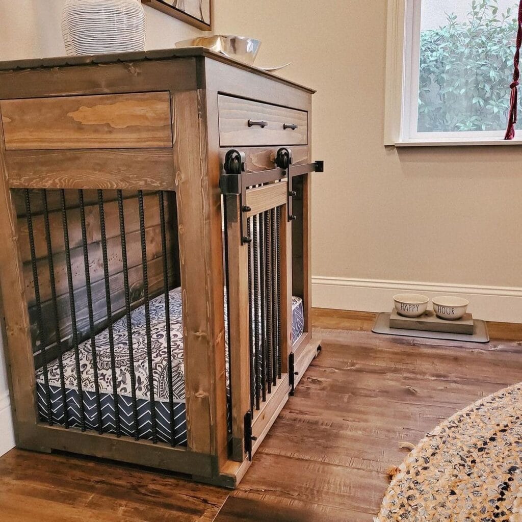 The star here is a dog crate console table — two drawers on top for storage, a barn-style X-panel cabinet door on the right side, and a front-access metal door with latch hardware. Tuck a bolster dog bed in grey fabric inside and you’re done.