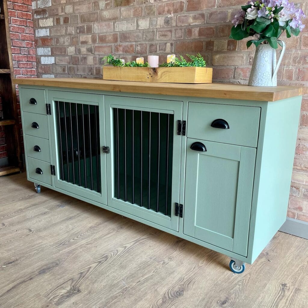 This sage green double dog crate sideboard is the answer you didn’t know you needed. It has a solid pine butcher-block top, matte black bar-style crate doors, and four slim drawers on the left side — it genuinely looks like a high-end sideboard from a boutique furniture store. And your golden would have real enclosed space that actually feels den-like and calm.