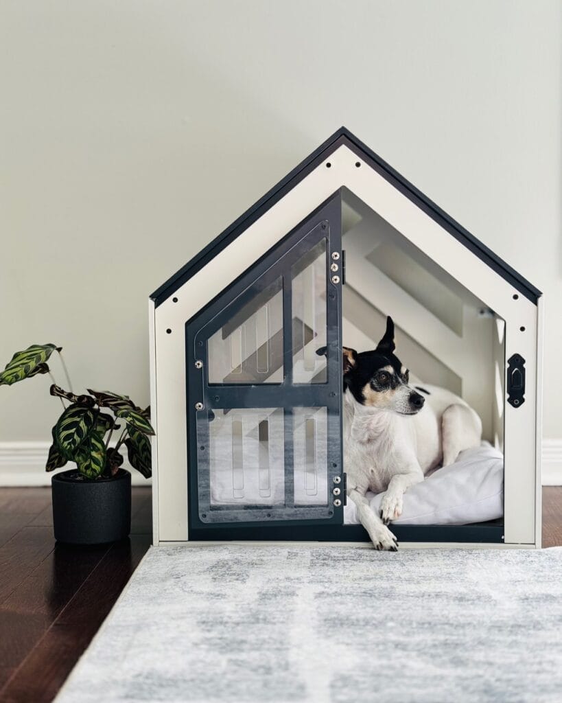 Picture this: a white-painted wood frame with dark charcoal trim, a clear acrylic door with a sliding panel design, and a fluffy white pillow inside. It’s the kind of setup that makes guests ask where you bought it before they even notice the dog.