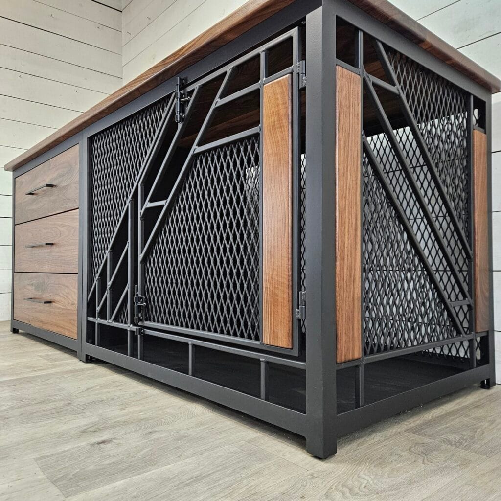 This piece is giving serious industrial-meets-farmhouse energy. We’re talking a double-bay steel crate with expanded metal diamond mesh panels, solid walnut wood top and accents, and a matte black powder-coated steel frame. The front doors open in a split-door configuration — top half and bottom half latch separately — which means your golden can poke her head out without the whole door swinging wide.