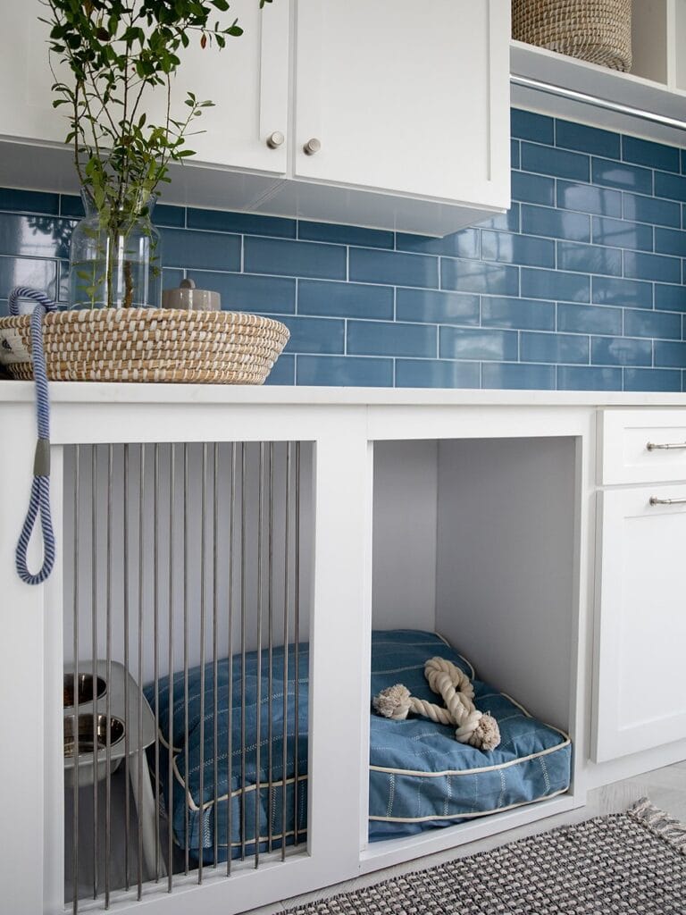 This built-in dog station tucks two pet nooks directly into the lower cabinetry, with steel vertical bar fronts on one side and an open-face cubby on the other. Blue subway tile runs the full backsplash, white shaker cabinets frame everything above, and blue linen cushions tie the whole thing together. Your dog gets a den. Your laundry room looks like a Pinterest board.