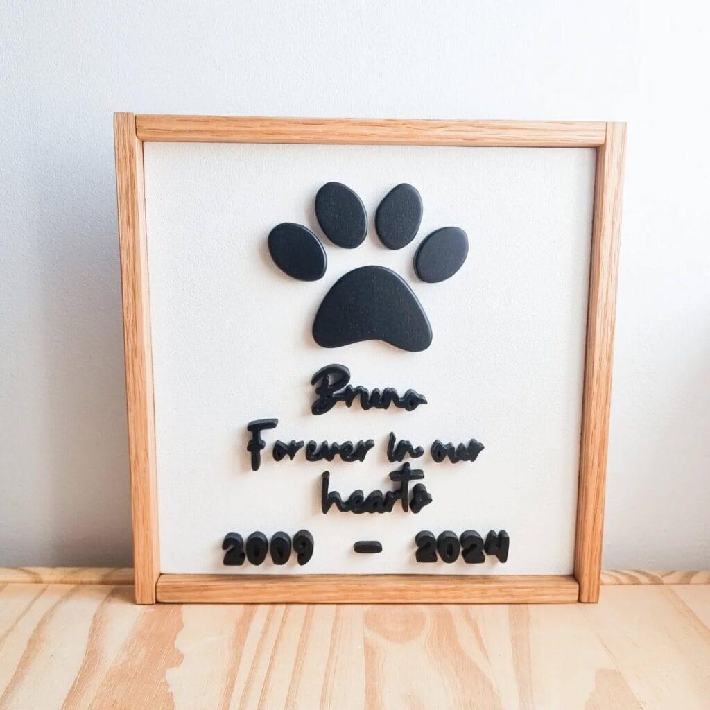 Hang beside family photos in your living room. She lights a candle underneath each night. Kids tell Oxmo stories before bed. Other pets pause there too. Creates a peaceful remembrance spot that doesn’t take over your decor. Guests ask about him. You share happy memories instead of just grief.