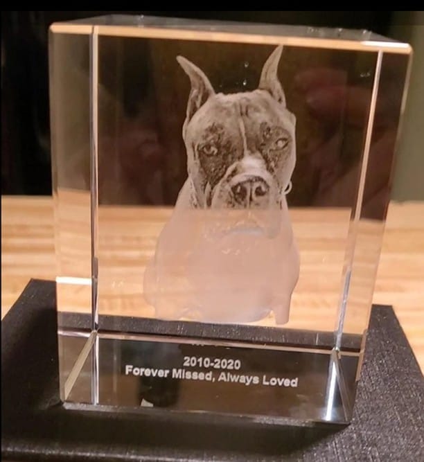 Your boxer’s face floats inside crystal glass. The laser-etched image captures every wrinkle, every wise eye. It sits on your coffee table where everyone can see.