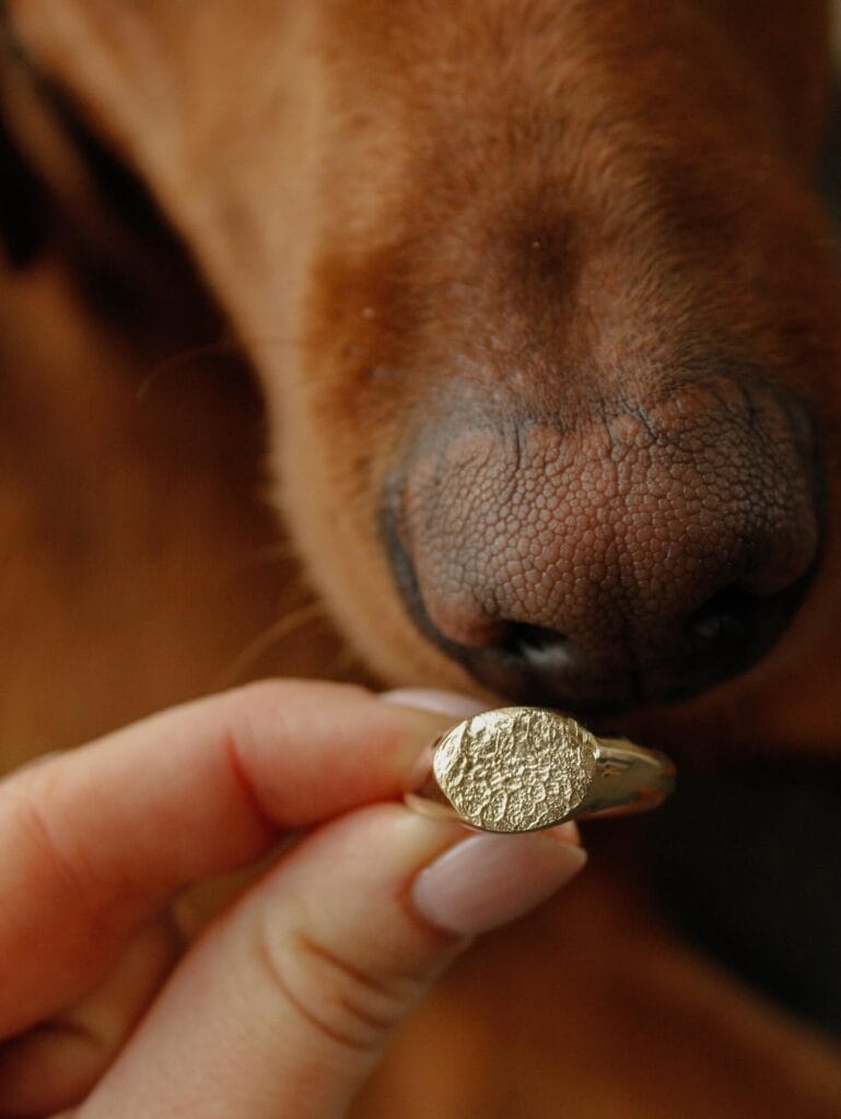 Your fingers reach for the ring before coffee every morning. The textured gold oval sits warm against your skin. His paw print pressed into metal—always with you now.