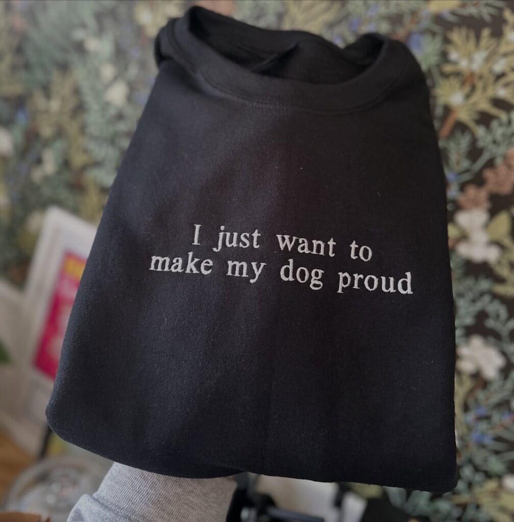 “I just want to make my dog proud” is screen-printed in vintage serif font on soft black cotton. The sweatshirt measures standard sizing from small to 2XL. Costs around $28 to $35 from custom print shops. Takes 3 days to print and ship.