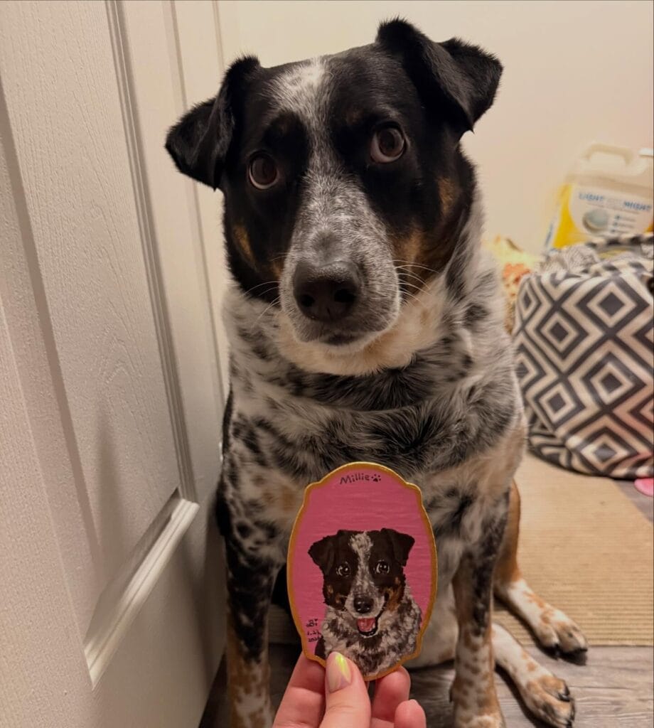 Millie sits with her portrait plaque every evening. Her human holds it during hard moments. That painted face brings comfort when the house feels too quiet.