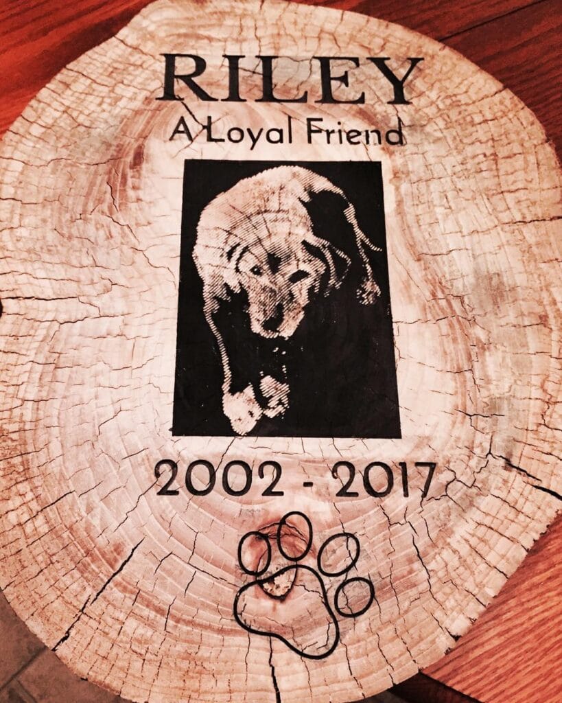 Your hand traces the grain circles each morning. Wood holds his photo. Paw print below. Riley’s still here, just differently now.