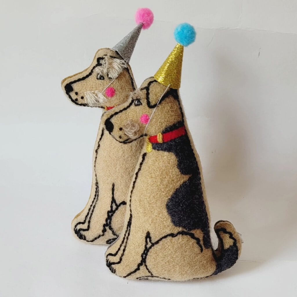 Start simple: Trace your dog’s profile on paper. Transfer to burlap. Embroider basic features. Then attach their actual party hat on top.