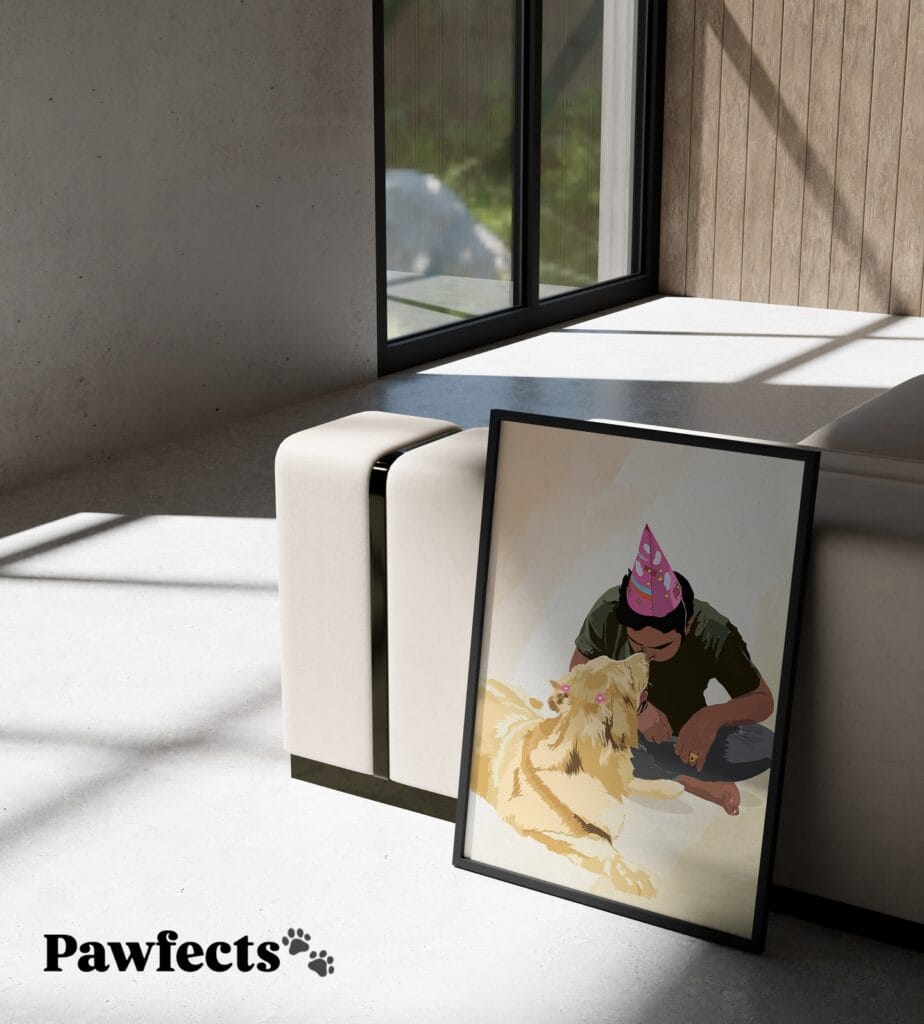 This heirloom display sits in your living room SO YOU CAN see your dog daily WHICH MEANS guests share memories of him too. The formal frame elevates pet art to family portrait status. Your other dog sniffs it during walks through the room. She knows that’s her brother.