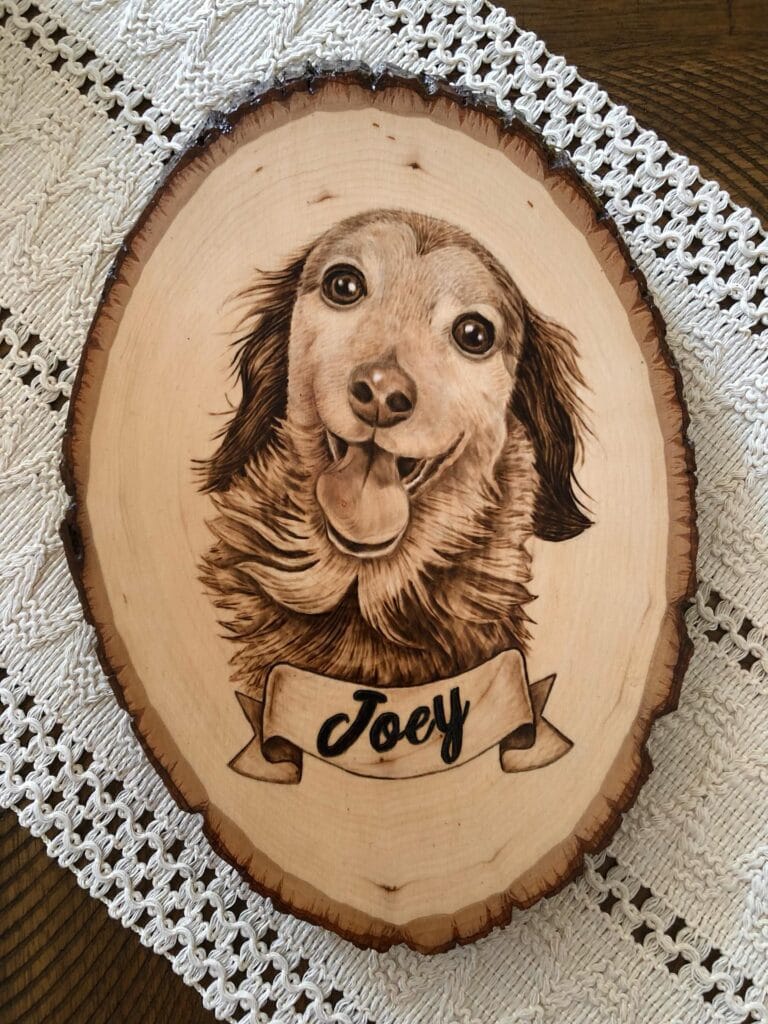 Wood burning creates permanent art you can’t erase or fade. The artist etches your dog’s face into a basswood slice, roughly 8-10 inches wide. Includes a ribbon banner with your dog’s name below the portrait. Takes 3-4 hours for detailed fur texture and soulful eyes. Costs $75-150 depending on artist and size.