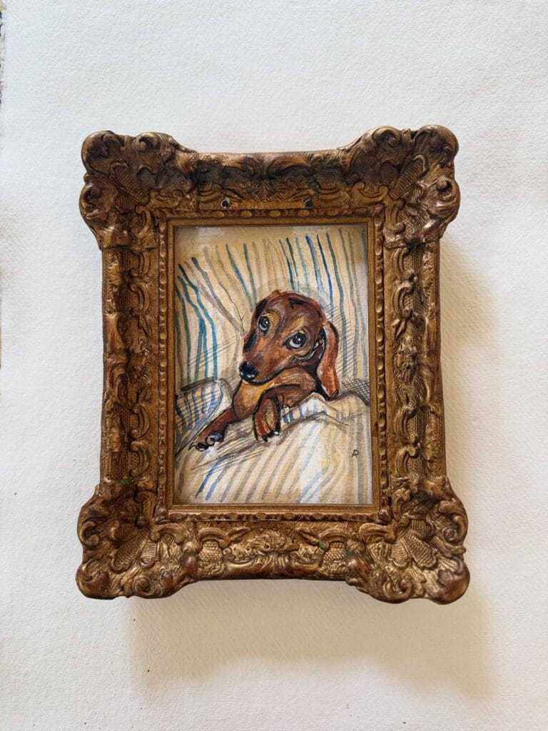 She painted her dachshund on ticking stripe fabric. Tucked him into an ornate gold frame. Now he sits on the mantle beside family photos.